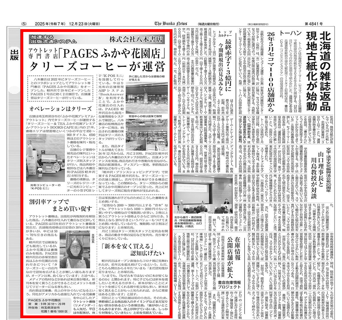 文化通信に「株式会社八木書店 アウトレット専門書店「PAGES ふかや花園店」タリーズコーヒーが運営」掲載